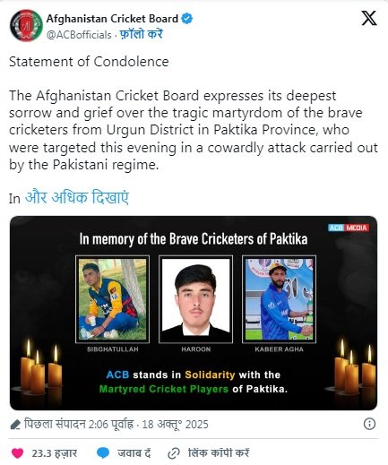 पाकिस्तान के हमले में अफगानिस्तान के 3 क्लब क्रिकेटर्स की मौत हो गई है। अफगानिस्तान क्रिकेट बोर्ड (ACB) ने इसकी पुष्टि की है। हमले में 14 अफगानी भी मारे गए हैं जबकि 16 घायल हैं। अफगान मीडिया टोलो न्यूज के मुताबिक, इन हमलों में उर्गुन और बर्मल जिलों के कई घरों को निशाना बनाया गया। ये इलाका दोनों देशों की बॉर्डर डूरंड लाइन के पास है।