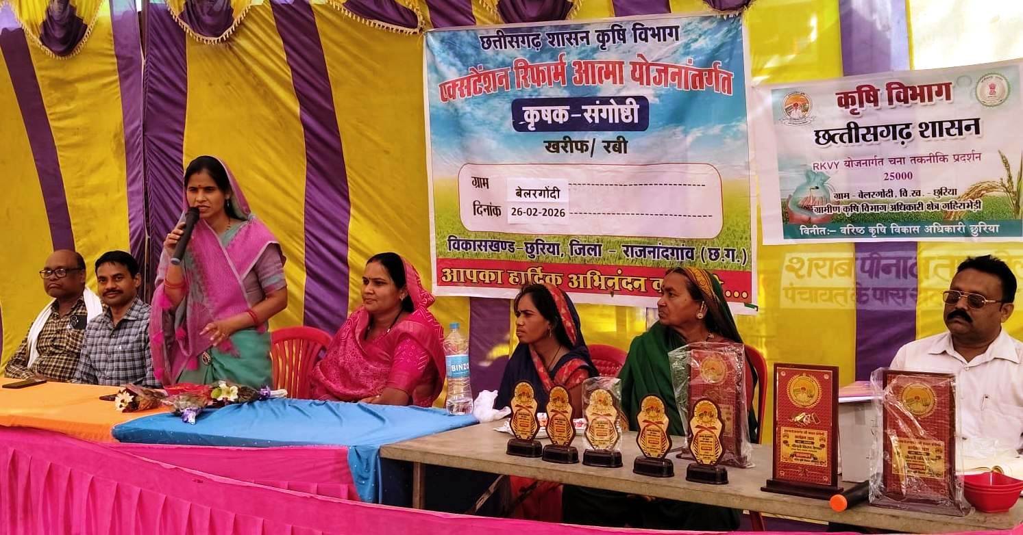 राजनांदगांव 27 फरवरी 2026। कृषि विभाग द्वारा एक्सटेंशन रिफार्म आत्मा योजनांतर्गत छुरिया विकासखंड के ग्राम बेलरगोंदी में कृषक संगोष्ठी का आयोजन किया गया। कार्यक्रम में जिला पंचायत अध्यक्ष श्रीमती किरण वैष्णव, जनपद पंचायत सदस्य  चंद्रिका वर्मा विशेष रूप से उपस्थित थे। कार्यक्रम में किसानों को आगामी खरीफ फसल के लिए आवश्यक मार्गदर्शन किया गया। इस दौरान जनप्रतिनिधियों एवं अधिकारियों द्वारा ग्राम बेलरगोदी के किसान  जयप्रकाश वर्मा के खेतों में पहुंचकर चना फसल का अवलोकन किया। इसके बाद ग्राम पंडरी पथरा पहुंचकर किसान  गेसराम साहू के खेत पहुंचकर मक्का फसल का भ्रमण किया। कार्यक्रम में सरपंच बेलरगोदी  लेखचंद वर्मा,  सोमनाथ वर्मा,  शंभू साहू,  चंद्रशेखर पतीला, कृषि विभाग से  जेपी सहडे,  सुदेश पटेल सहित अन्य जनप्रतिनिधि एवं ग्रामीण उपस्थित थे।