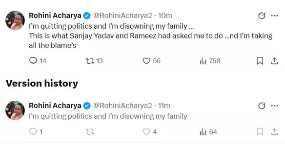 बिहार में मिली करारी हार के बाद रोहिणी आचार्य बोलीं- परिवार से नाता तोड़ रही हूं, संजय यादव पर लगाए गंभीर आरोप