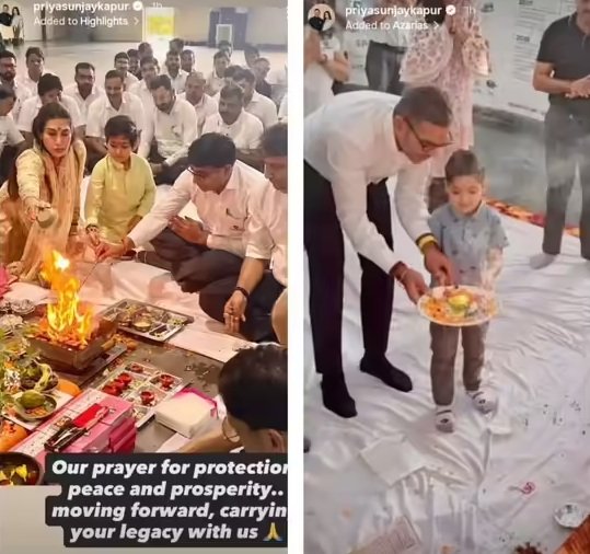 शुक्रवार को, प्रिया सचदेव ने इंस्टाग्राम स्टोरीज पर इस समारोह की कुछ झलकियां शेयर कीं। एक तस्वीर में वे अपने बेटे अजारियस के साथ पूजा करते हुए दिखाई दे रही थीं, जबकि दूसरी तस्वीर में उनके दिवंगत पति संजय कपूर पिछले सालों में अपने बेटे के साथ यही रस्म निभाते हुए दिखाई दे रहे थे।