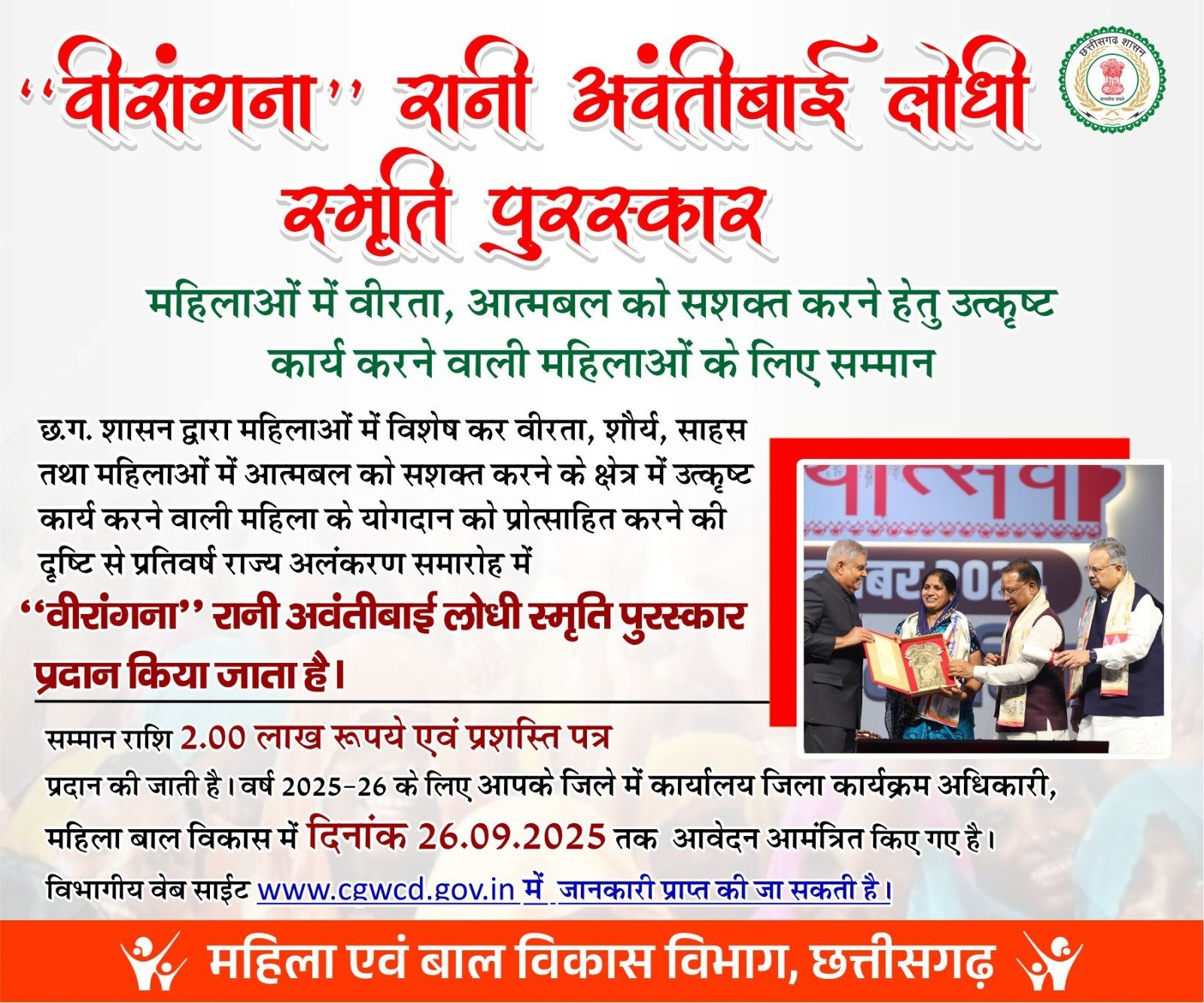 वर्ष 2025-26 में “वीरांगना” रानी अवंतीबाई लोधी स्मृति पुरस्कार प्रदान के लिए कार्यालय जिला कार्यक्रम अधिकारी, महिला बाल विकास जशपुर में 26 सितम्बर 2025 तक आवेदन आमंत्रित किए गए है। उक्त संबंध में अधिक जानकारी विभागीय वेबसाइट www.cgwcd.gov.in में जानकारी प्राप्त की जा सकती है।