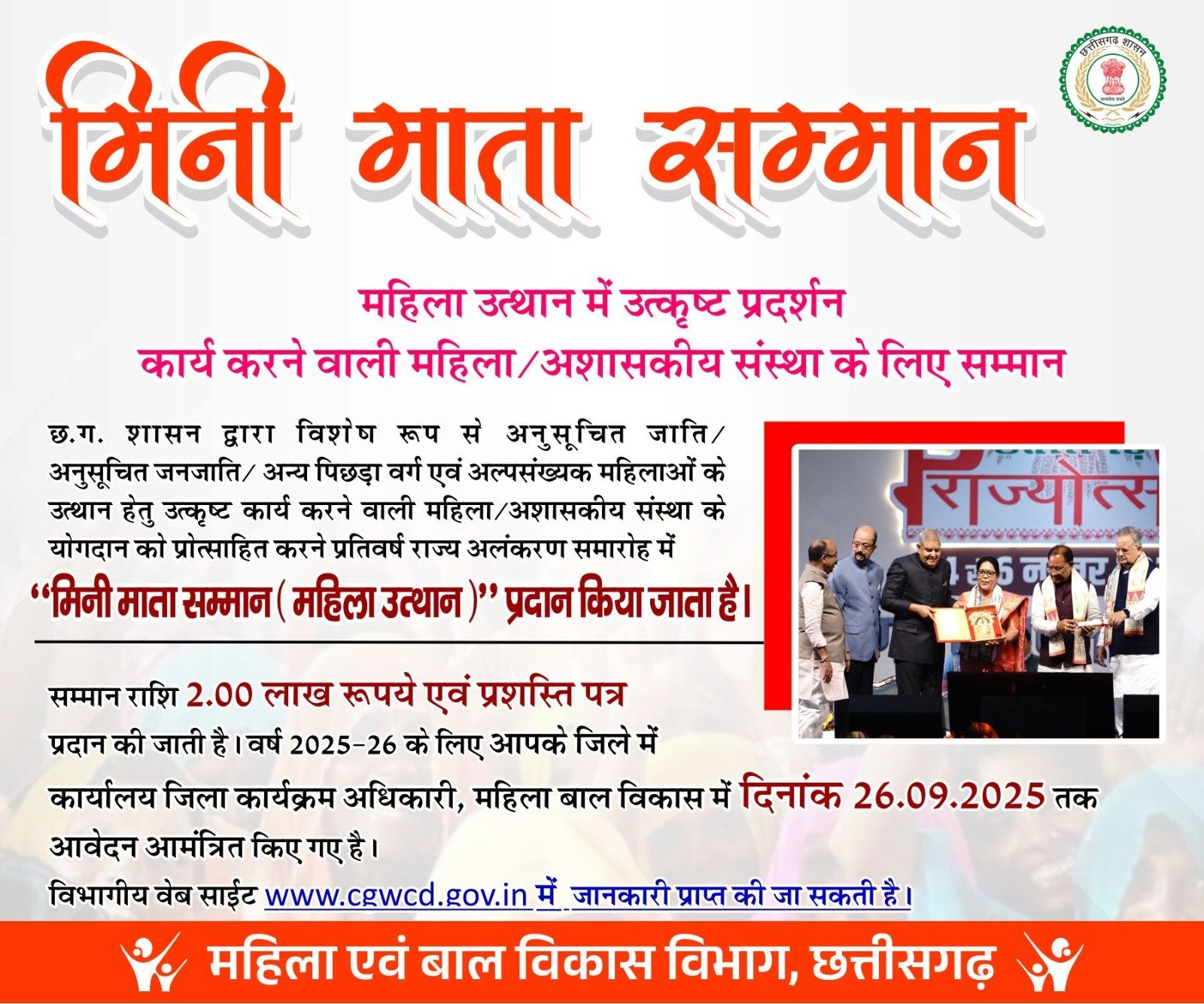 जशपुरनगर 15 सितम्बर 2025/ छ.ग. शासन द्वारा विशेष रूप से अनुसूचित जाति, अनुसूचित जनजाति, अन्य पिछड़ा वर्ग एवं अल्पसंख्यक महिलाओं के उत्थान हेतु उत्कृष्ट कार्य करने वाली महिला व अशासकीय संस्था के योगदान को प्रोत्साहित करने प्रतिवर्ष राज्य अलंकरण समारोह में मिनी माता सम्मान (महिला उत्थान) प्रदान किया जाता है। जिसमें 2 लाख रूपए की सम्मान राशि और प्रशस्ति पत्र प्रदान किया जाता है।