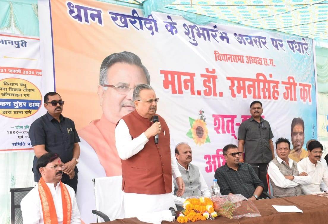 विधानसभा अध्यक्ष डॉ. रमन सिंह ने धान उपार्जन केन्द्र भानपुरी में पूजा-अर्चना कर धान खरीदी का किया शुभारंभ
