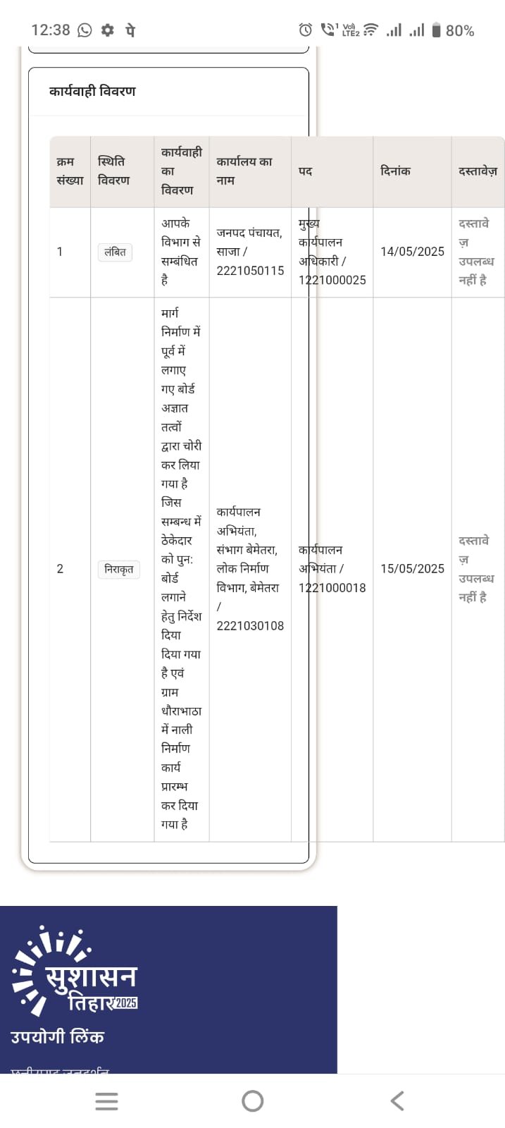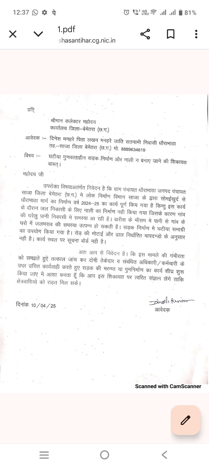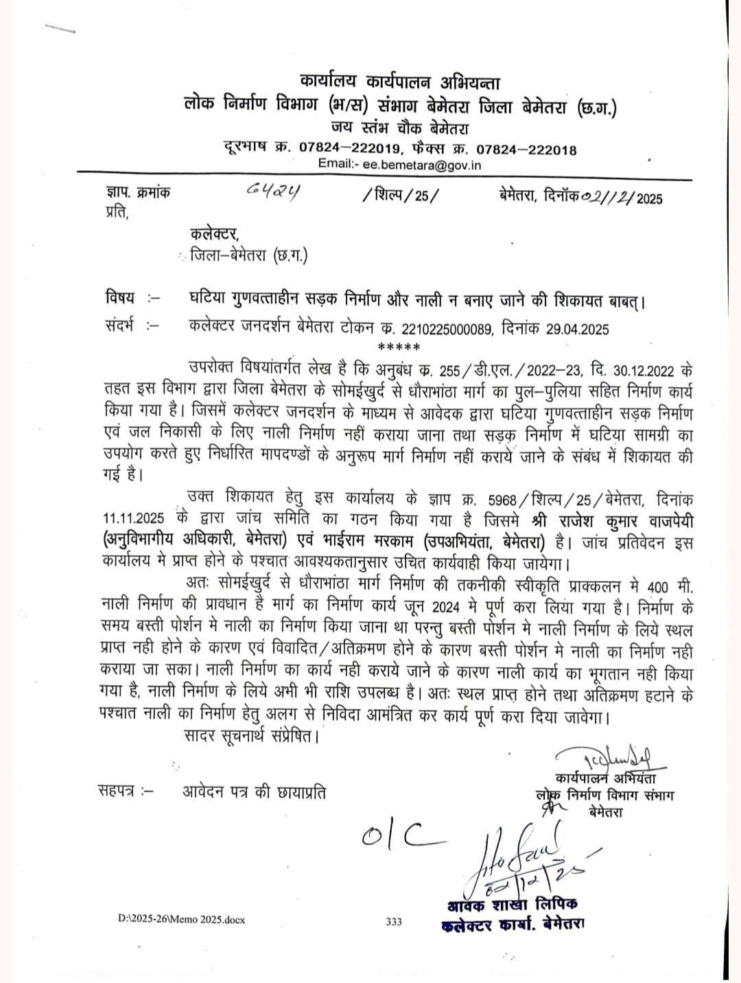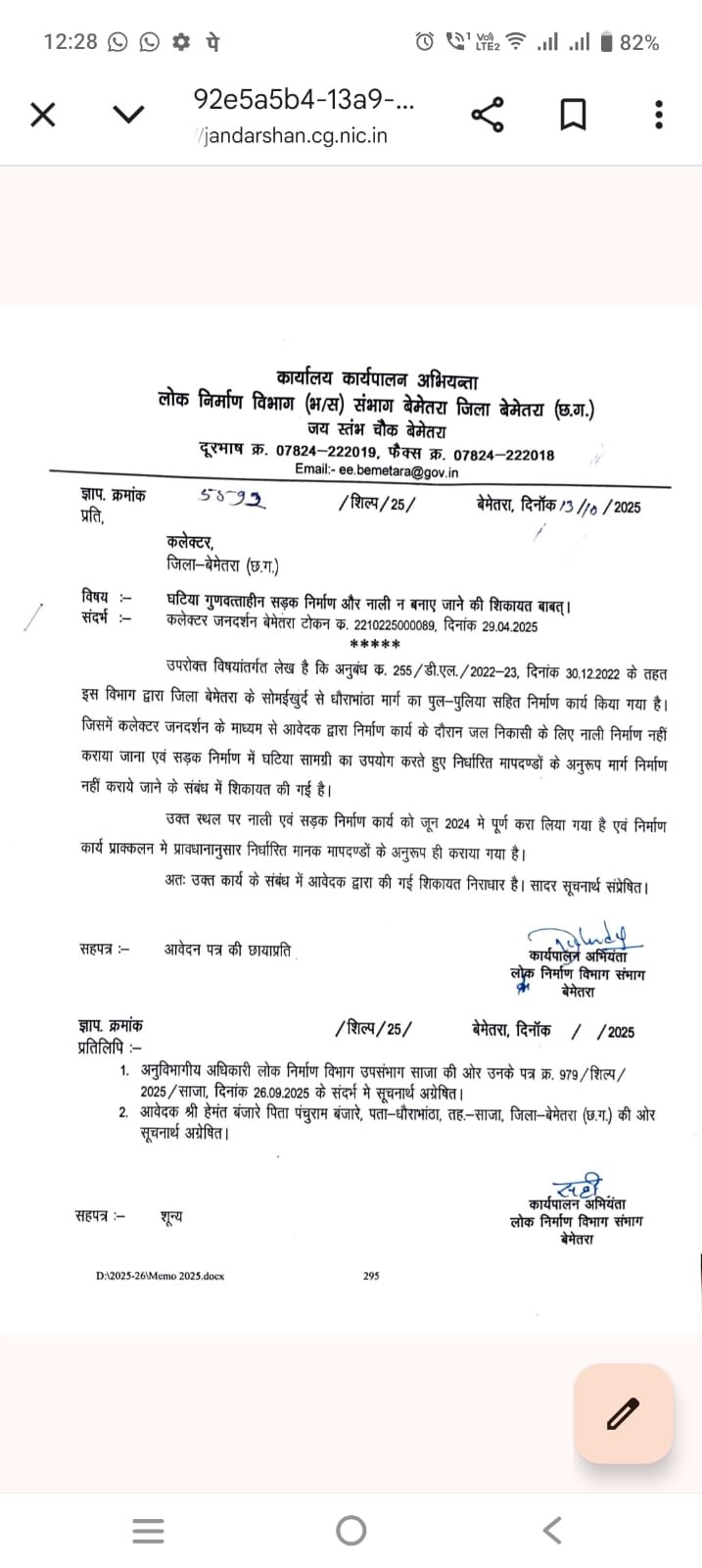 13/10/2025 – कार्यपालन अभियंता ने पत्र क्रमांक 5592 में दावा किया कि सड़क एवं नाली निर्माण जून 2025 में पूर्ण हो चुका है, शिकायत निराधार है।