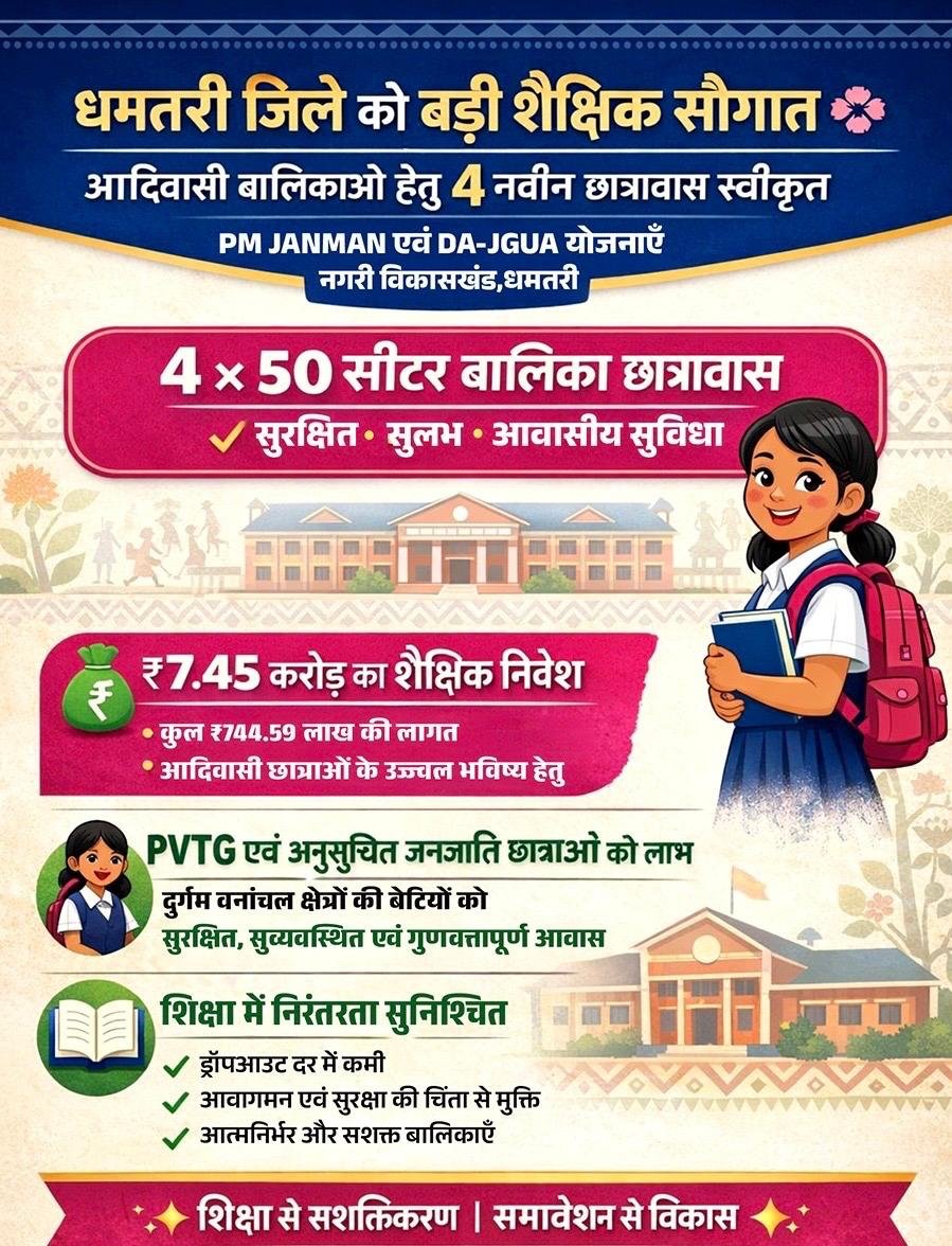 धमतरी जिले के नगरी विकासखंड में अध्ययनरत PVTGs (विशेष रूप से पिछड़ी जनजाति) एवं अन्य अनुसूचित जनजाति के विद्यार्थियों के लिए चार छात्रावासों के निर्माण को स्वीकृति प्रदान की गई है। यह पहल दूरस्थ एवं आदिवासी क्षेत्रों में शिक्षा की पहुंच और गुणवत्ता सुदृढ़ करने की दिशा में एक ऐतिहासिक कदम मानी जा रही है।