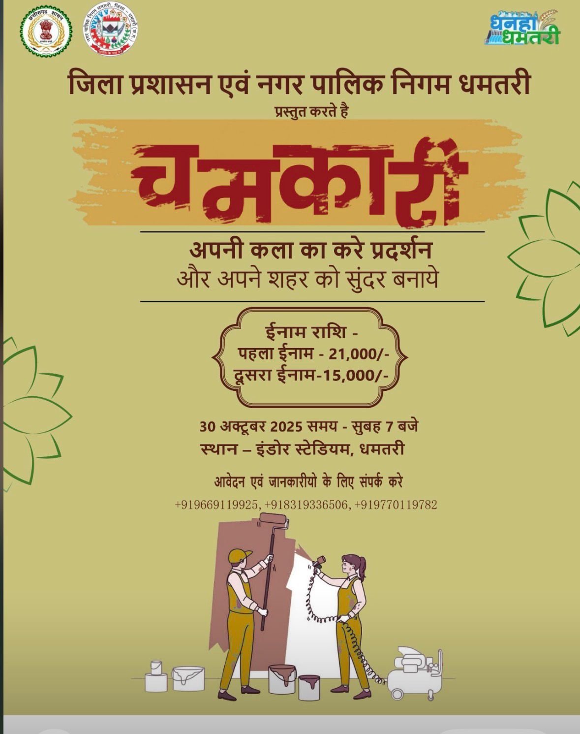 धमतरी । शहर की सुंदरता और सृजनशीलता को निखारने के उद्देश्य से जिला प्रशासन एवं नगर पालिका निगम धमतरी द्वारा ‘चमकारी– अपनी कला का करे प्रदर्शन और अपने शहर को सुंदर बनाये’ कार्यक्रम का आयोजन किया जा रहा है। यह आयोजन कल 30 अक्टूबर 2025 को प्रातः 7 बजे से इंडोर स्टेडियम धमतरी में आयोजित होगा।