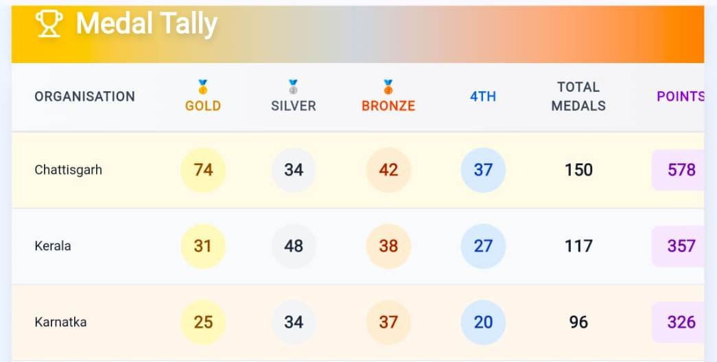 *छत्तीसगढ़ 150 मेडल और 578 अंक के साथ पहले स्थान पर*