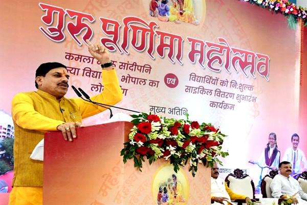 मुख्यमंत्री डॉ. यादव ने प्रदेश के सभी शिक्षकों एवं छात्रों को गुरु पूर्णिमा महोत्सव की शुभकामानाएं देते हुए कहा कि प्रदेश में 369 सांदीपनि विद्यालय संचालित हो रहे हैं। जहां शिक्षा केवल किताबों तक सीमित नहीं है, स्कूल विद्यार्थियों के सर्वांगीण विकास के केंद्र बनकर उभरे हैं। मुख्यमंत्री डॉ. यादव ने शत-प्रतिशत परीक्षा परिणाम के लिए महू, देवास, नरसिंहपुर के विद्यालयों को बेहतर शैक्षणिक प्रबंधन विकास के लिए 5-5 लाख रुपए देने की घोषणा की। मुख्यमंत्री डॉ. यादव ने कहा कि विश्वविद्यालयों के कुलपतियों को कुलगुरु की संज्ञा दी गई है, क्योंकि गुरु ही हमें अंधकार से प्रकाश की ओर ले जाते हैं। मुख्यमंत्री डॉ. यादव गुरुवार को शासकीय कमला नेहरू सांदीपनि विद्यालय में आयोजित गुरु पूर्णिमा महोत्सव को संबोधित कर रहे थे।