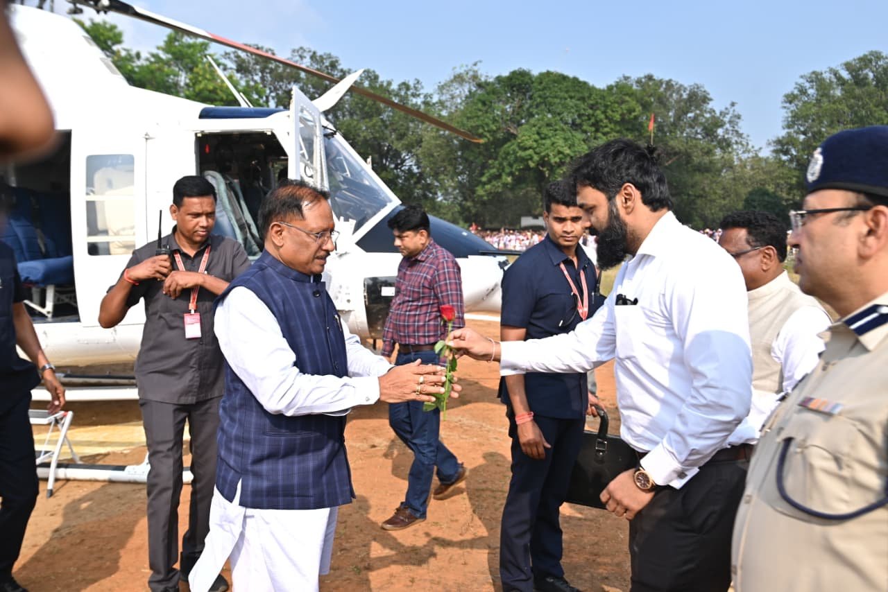जशपुरनगर 19 अक्टूबर 2025/ मुख्यमंत्री श्री विष्णुदेव साय माध्यमिक विद्यालय खेल मैदान हेलीपैड, ग्राम कंडोरा पहुंचे। इस अवसर पर सांसद श्री राधेश्याम राठिया, कमिश्नर श्री नरेंद्र दुग्गा, आईजी श्री दीपक कुमार झा, श्री कलेक्टर श्री रोहित व्यास, पुलिस अधीक्षक श्री शशिमोहन सिंह, वनमण्डलाधिकारी श्री शशि कुमार सहित जनप्रतिनिधियों, अधिकारियों और रौतिया समाज के पदाधिकारियों ने उनका आत्मीय स्वागत किया। हेलीपैड पर पारंपरिक करमा नर्तक दलों ने उत्साहपूर्वक नृत्य प्रस्तुत कर मुख्यमंत्री का अभिनंदन किया और मनमोहक करमा नृत्य करते हुए उन्हें भव्य स्वागत के साथ कार्यक्रम स्थल तक लेकर गए।