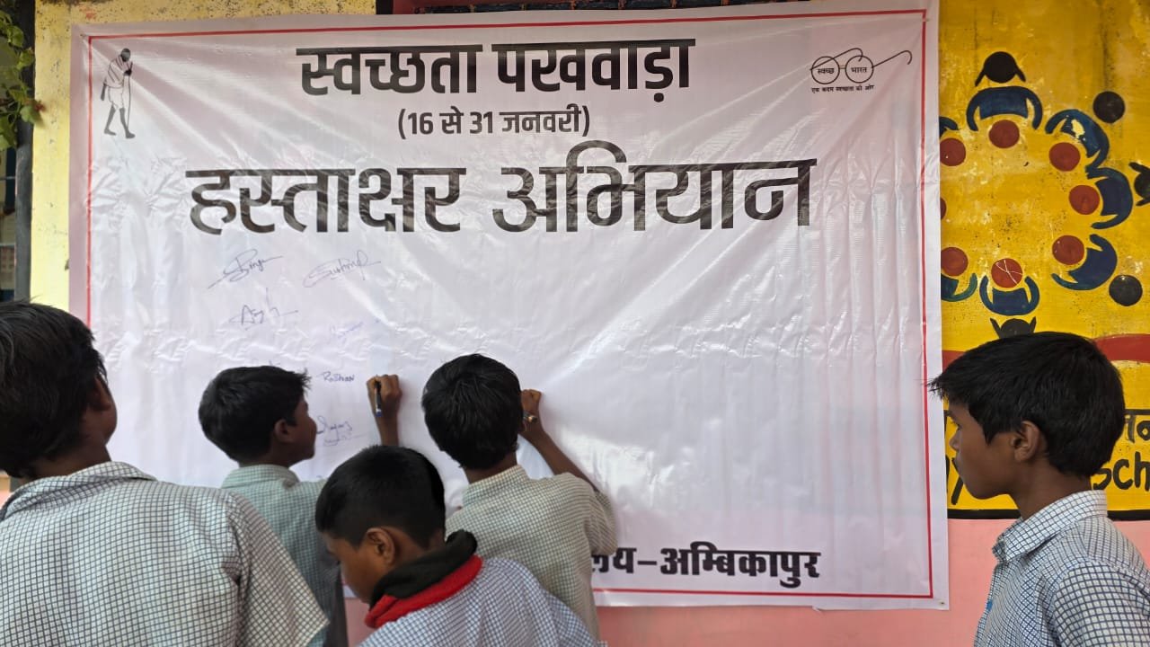 अंबिकापुर 28 जनवरी 2026/ भारत सरकार,सूचना एव प्रसारण मंत्रालय के केंद्रीय संचार ब्यूरो द्वारा सरगुजा जिले के ग्राम कुबेरपूर के प्राथमिक शाला में “स्वच्छता पखवाड़ा“ कार्यक्रम का आयोजन किया गया। कार्यक्रम में जिला मिशन समन्वयक सर्वजीत पाठक, संकुल प्रभारी श्री तेज भान कुजूर, शाला की प्रधान पाठिका उमा सिन्हा, उप सरपंच श्री पिंटू पांडेय शिक्षिका गीता मिश्रा,शिक्षिका पम्मी सिंह, नरेश चंद्र कुशवाहा, SMC सदस्य श्री रामदीन जी, सरपंच अनीता कुजूर, तथा बहुतायत संख्या में ग्रामवासी उपस्थित रहे।
