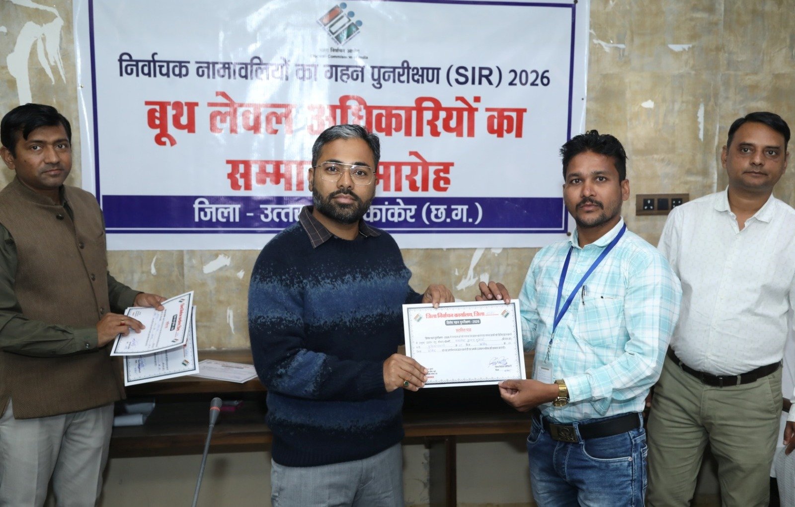भारत निर्वाचन आयोग के निर्देशानुसार जिले में मतदाता सूची के अद्यतन एवं शुद्धिकरण हेतु विशेष गहन पुनरीक्षण का कार्य जारी है। इसके तहत बीएलओ 04 नवम्बर से 04 दिसम्बर के बीच मतदाताओं के घर-घर जाकर गणना प्रपत्र का वितरण एवं प्राप्त कर डिजिटाइजेशन एवं सत्यापन का कार्य कर रहे हैं। जिले के तीनों विधानसभा क्षेत्रों के विभिन्न मतदान केन्द्रों में शत-प्रतिशत मतदाताओं के गणना प्रपत्र का डिजिटाइजेशन कार्य पूर्ण करने वाले 37 बूथ लेवल अधिकारियों (बीएलओ) को आज कलेक्टर एवं जिला निर्वाचन अधिकारी निलेशकुमार महादेव क्षीरसागर द्वारा प्रशस्ति पत्र प्रदान कर सम्मानित किया गया।