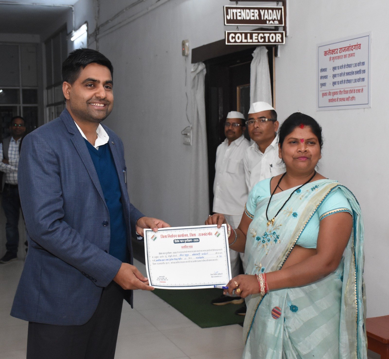 कलेक्टर एवं जिला निर्वाचन अधिकारी जितेन्द्र यादव ने कलेक्टोरेट में निर्वाचक नामावलियों का विशेष गहन पुनरीक्षण (एसआईआर) अंतर्गत उत्कृष्ट कार्य करने वाले बीएलओ को प्रशस्ति पत्र प्रदान कर सम्मानित किया। कलेक्टर द्वारा विधानसभा क्षेत्र क्रमांक 75-राजनांदगांव अंतर्गत आने वाले मतदान केन्द्र क्रमांक 22 बजरंगपुर नवागांव की आंगनबाड़ी कार्यकर्ता एवं बीएलओ सुनीता सेवता तथा मतदान केन्द्र क्रमांक 17 पेण्ड्री की आंगनबाड़ी कार्यकर्ता एवं बीएलओ जीनत ठाकुर को प्रशस्ति पत्र प्रदान कर सम्मानित किया।