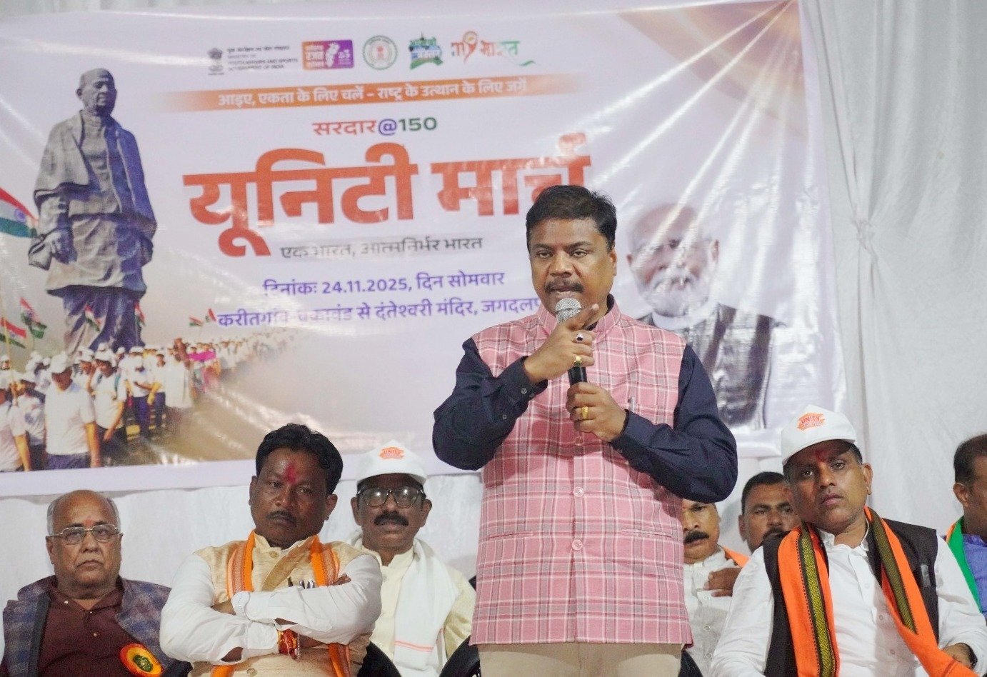 रायपुर, 26 नवम्बर 2025/ लौह पुरुष सरदार वल्लभ भाई पटेल की 150 वीं जयंती के उपलक्ष्य में बस्तर जिले में खेल एवं युवा कल्याण विभाग द्वारा आयोजित 15 किलोमीटर लंबी एकता मार्च (यूनिटी मार्च) का सोमवार को जगदलपुर टाउन क्लब में भव्य समापन हुआ। यह पदयात्रा विकासखण्ड बकावंड के करीतगांव से आरंभ हुई, जिसमें जनप्रतिनिधियों, अधिकारी-कर्मचारियों, सामाजिक कार्यकर्ताओं, युवाओं, एनसीसी और एनएसएस कैडेट्स सहित बड़ी संख्या में स्थानीय नागरिकों ने उत्साहपूर्वक भाग लिया। सभी ने एकता, भाईचारे और राष्ट्रीय एकजुटता का संदेश दिया।