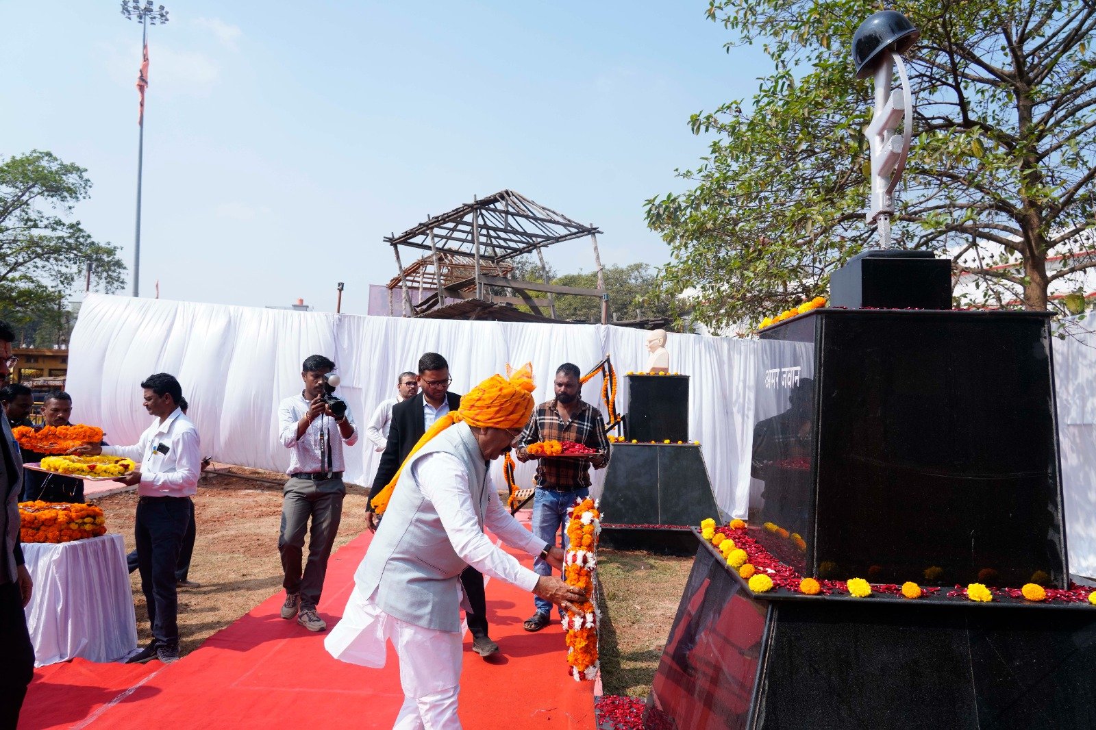 उप मुख्यमंत्री अरुण साव ने लालबाग परेड मैदान में आयोजित मुख्य समारोह के पश्चात जगदलपुर के सिरहासार भवन के नजदीक स्थित शहीद स्मारक अमर जवान ज्योति में शहीदों को श्रद्धा सुमन अर्पित कर श्रद्धांजलि दी।