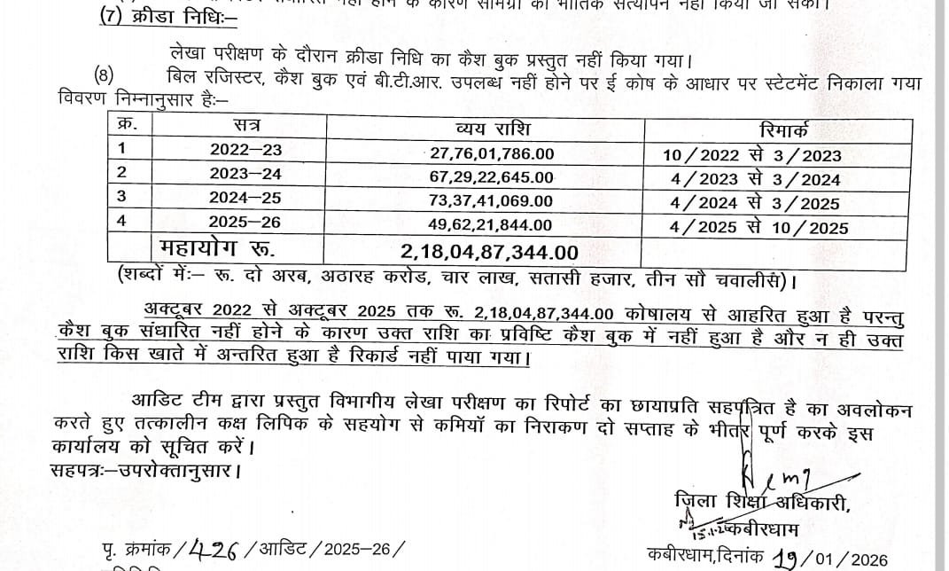 आरटीआई से मिली जानकारीनुसार जिला शिक्षा अधिकारी ने नवम्बर 2025 में विकास खंड शिक्षा अधिकारी कार्यालय का विभागीय लेखा परीक्षण 5 सदस्यीय जिला आडिट टीम के माध्यम से 24 नवम्बर 2025 व 25 नवम्बर 2025 को करवाया गया । जिला आडिट टीम ने अपने आडिट रिपोर्ट में बताया कि विकासखंड शिक्षाधिकारी कार्यालय द्वारा लेखा परीक्षण के दौरान क्रीड़ा निधि की कैश बुक प्रस्तुत नही की गई इसी तरह बिल रजिस्टर , कैश बुक , बीटीआर उपलब्ध नही होने पर ई कोष के आधार पर स्टेटमेंट निकाल गया जिसके अनुसार वर्ष अक्टूबर 2022 से मार्च 2023 तक 27 करोड़ 76 लाख 1 हजार 786 रुपये , वर्ष अप्रैल 2023 से मार्च 2024 तक 67 करोड़ 29 लाख 22 हजार 645 रुपये , वर्ष अप्रैल 2024 से मार्च 2025 तक 73 करोड़ 37 लाख 41 हजार 69 रुपये एवं वर्ष अप्रैल 2025 से अक्टूबर 2025 तक 49 करोड़ 62 लाख 1 हजार 844 रुपये इस तरह कुल 2 अरब 18 करोड़ 4 लाख 87 हजार 344 रुपये अक्टूबर 2022 से अक्टूबर 2025 के बीच जिला कोषालय से आहरित हुए है किंतु कैश बुक संधारित्र नही होने के कारण उक्त राशि किंस खाते में अंतरित हुई है का कोई रिकॉर्ड नही पाया गया ।
