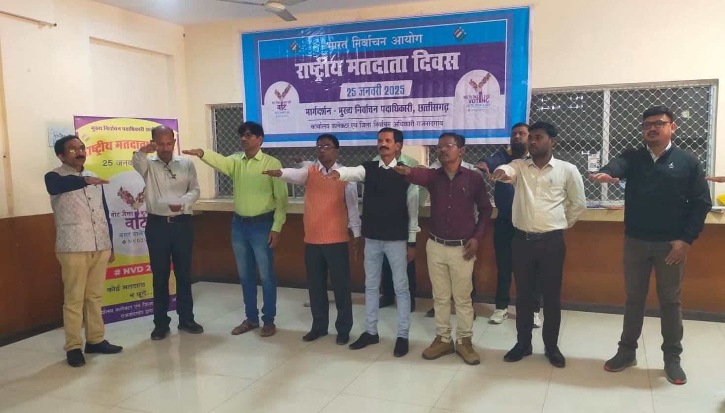 राजनांदगांव 24 जनवरी 2025। राष्ट्रीय मतदाता दिवस के अवसर पर कलेक्टर श्री संजय अग्रवाल के निर्देशन में संयुक्त कलेक्टर श्री खेमलाल वर्मा ने आज कलेक्टोरेट राजनांदगांव के अधिकारियों-कर्मचारियों को शपथ दिलाई। संयुक्त कलेक्टर ने अधिकारियों-कर्मचारियों को शपथ दिलाते हुए कहा कि हम भारत के नागरिक, लोकतंत्र में अपनी पूर्ण आस्था रखते हुए यह शपथ लेते हैं कि हम अपने देश की लोकतांत्रिक परम्पराओं की मर्यादा को बनाए रखेंगे तथा स्वतंत्र, निष्पक्ष एवं शांतिपूर्ण निर्वाचन की गरिमा को अक्षुण्ण रखते हुए, निर्भीक होकर, धर्म, वर्ग, जाति, समुदाय, भाषा अथवा अन्य किसी भी प्रलोभन से प्रभावित हुए बिना सभी निर्वाचनों में अपने मताधिकार का प्रयोग करेंगे। इस अवसर पर संयुक्त कलेक्टर श्रीमती सरस्वती बंजारे सहित कलेक्टोरेट के अधिकारी-कर्मचारियों ने शपथ ली।