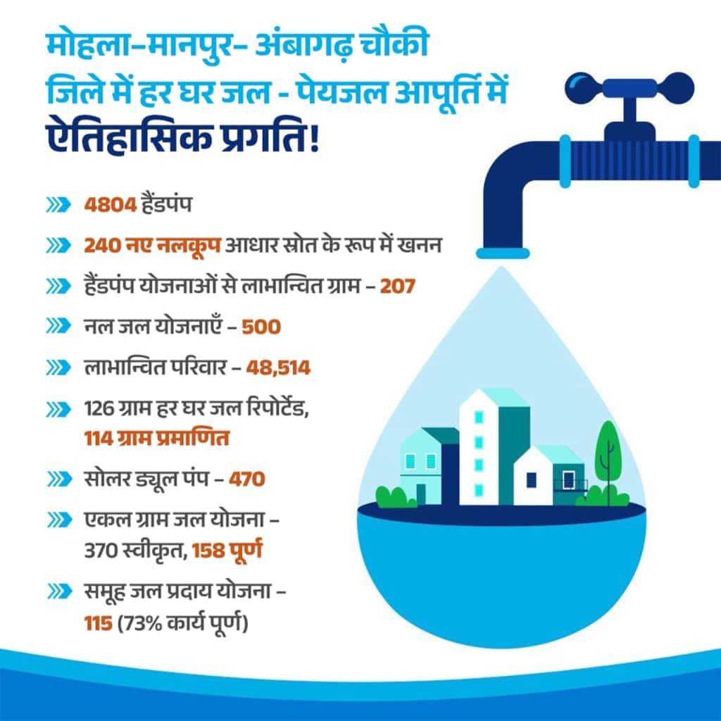 इसी प्रकार समूह जल प्रदाय योजना के तहत वर्ष 2022-25 के दौरान 102 योजनाएं क्रियान्वित की गई और वर्ष 2025 तक इनकी संख्या 115 तक पहुंच गई। इन सभी योजनाओं के औसतन 73 प्रतिशत कार्य पूर्ण हो चुके हैं। इस तरह मोहला-मानपुर-अंबागढ़ चौकी जिले में वर्ष 2025 तक लगभग 48 हजार 514 परिवारों को घर-घर नल से शुद्ध पेयजल सुविधा प्राप्त हो चुकी है, जो जिले के लिए एक बड़ी उपलब्धि है। हर घर जल के लक्ष्य की दिशा में एक महत्वपूर्ण कदम साबित हुआ है।