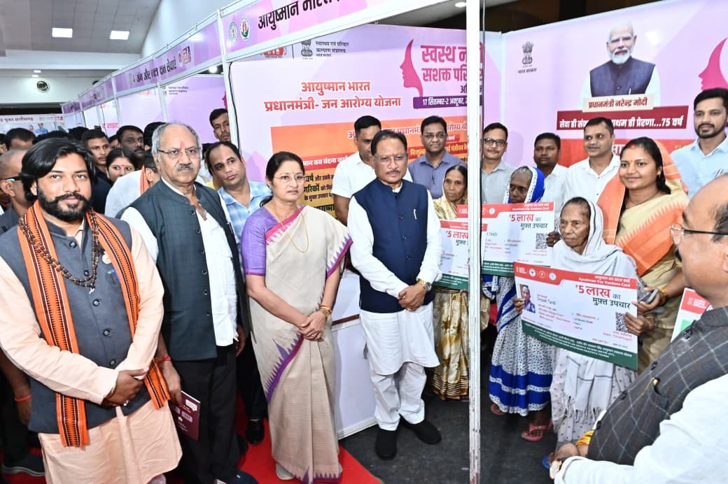 मुख्यमंत्री श्री विष्णु देव साय ने आज राजधानी रायपुर के कृषि मंडमप में स्वस्थ नारी सशक्त परिवार अभियान के शुभारंभ के अवसर पर पोषण माह कैलेंडर का विमोचन किया। उन्होंने बेटी बचाओ बेटी पढ़ाओ अभियान के तहत मेधावी छात्राओं को सम्मानित भी किया। इस दौरान उन्होंने प्रधानमंत्री श्री नरेंद्र मोदी के जन्मदिन के अवसर पर विशेष रूप से आयोजित स्वास्थ्य शिविर और महिला एवं बाल विकास विभाग के स्टालों का अवलोकन कर जानकारी लीं। विशेष रूप से पोषण संगोष्ठी, हमर स्वस्थ लइका, रेडी-टू-ईट, छत्तीसगढ़ के मिलेट्स, मिशन शक्ति, मिशन वात्सल्य, बाल विवाह मुक्त अभियान, मानसिक स्वास्थ्य, टीबी जांच, ईएनटी, सिकल सेल जांच, किशोरी स्वास्थ्य, मातृत्व स्वास्थ्य के लिए केंद्रित स्टालों को देखा और आगंतुकों से शासकीय योजनाओं से मिल रहे लाभ के संबंध में चर्चा की।