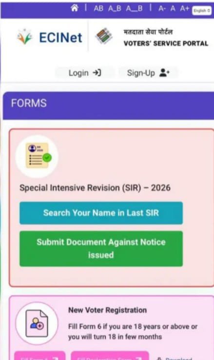 भारत निर्वाचन आयोग द्वारा मतदाता सूची के विशेष गहन पुनरीक्षण (SIR-2026) की प्रक्रिया को और अधिक सरल, पारदर्शी एवं नागरिक-अनुकूल बनाने के उद्देश्य से ECINET पोर्टल पर एक नया ऑनलाइन फीचर प्रारंभ किया गया है। इस सुविधा के माध्यम से SIR-2026 के अंतर्गत मतदाताओं को जारी किए गए नोटिस के संबंध में आवश्यक दस्तावेज अब ऑनलाइन अपलोड किए जा सकेंगे।