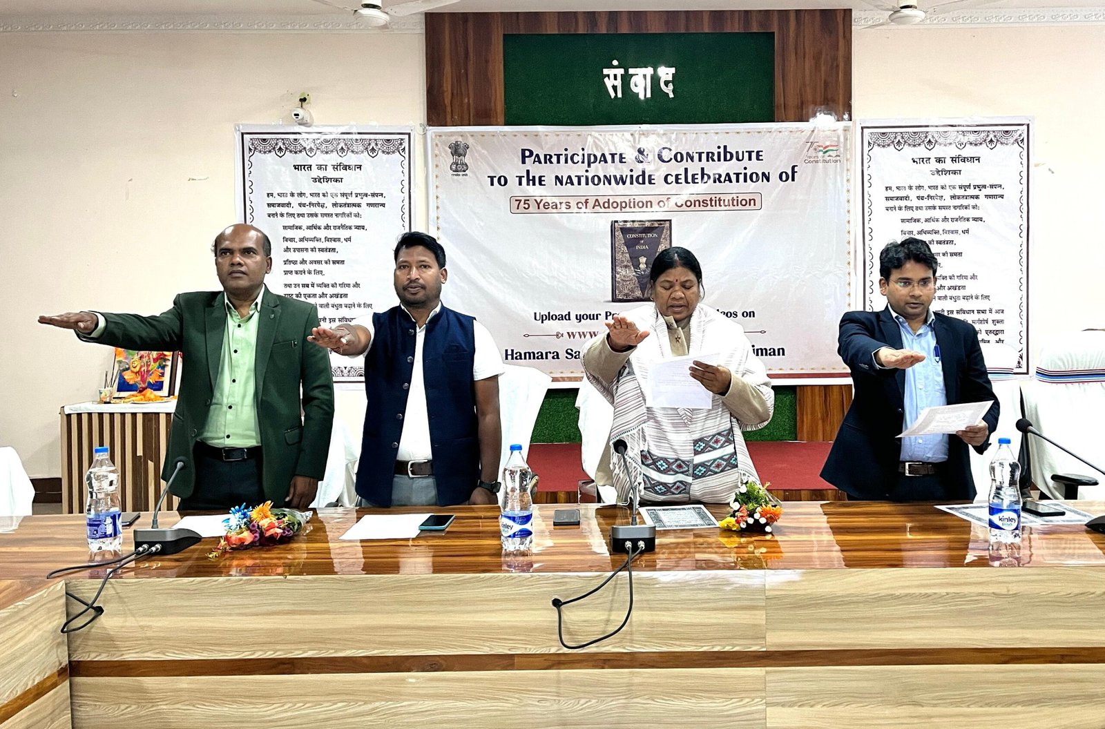 भारत का संविधान 26 नवंबर 1949 को अंगीकृत किया गया था। इस ऐतिहासिक दिवस की स्मृति में प्रतिवर्ष संविधान दिवस मनाया जाता है। इसी कड़ी में आज जिला पंचायत कार्यालय में विधायक श्रीमती रायमुनी भगत द्वारा अधिकारियों एवं कर्मचारियों को संविधान की शपथ दिलाई गई। इस दौरान वहां मौजूद नगर पालिका अध्यक्ष जशपुर श्री अरविंद भगत, जिला पंचायत उपाध्यक्ष श्री शौर्य प्रताप सिंह जूदेव, मुख्य कार्यपालन अधिकारी श्री अभिषेक कुमार ने भी संविधान की शपथ ली। इसी प्रकार जिले के सभी एसडीएम कार्यालयों तथा विभिन्न शासकीय विभागों में भी संविधान की शपथ ली गई, जिसमें उपस्थित अधिकारियों-कर्मचारियों ने संविधान के प्रति निष्ठा जताते हुए देश की एकता, अखंडता और लोकतांत्रिक मूल्यों को बनाए रखने का संकल्प लिया