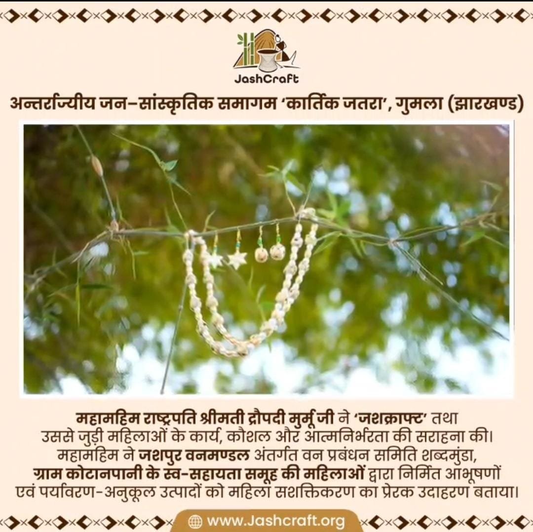 राष्ट्रपति द्रौपदी मुर्मू एवं मुख्यमंत्री छत्तीसगढ़ शासन विष्णु देव साय को जशक्राफ्ट ब्रांड के अंतर्गत स्थानीय प्राकृतिक संसाधनों- बाँस एवं सवई घास से निर्मित आकर्षक हस्तशिल्प उत्पादों को पारंपरिक कलाकृतियों के रूप में उपहार स्वरूप भेंट किया गया। राष्ट्रपति श्रीमती द्रौपदी मुर्मू ने जशक्राफ्ट के हस्तशिल्प उत्पादों को देखकर विशेष प्रसन्नता व्यक्त की तथा स्थानीय कारीगरों द्वारा प्राकृतिक संसाधनों के संरक्षण के साथ विकसित की गई इन पारंपरिक कलाकृतियों की भूरि-भूरि प्रशंसा की। यह अवसर जशपुर जिले की समृद्ध जनजातीय कला, स्थानीय कारीगरों के उत्कृष्ट कौशल तथा जशपुर वनमंडल द्वारा किए जा रहे नवाचारपूर्ण एवं जनकल्याणकारी प्रयासों के लिए एक गौरवपूर्ण क्षण रहा।