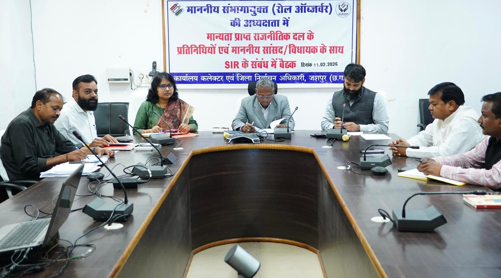 जशपुरनगर 11 फरवरी 2026/ IMNB NEWS AGENCY भारत निर्वाचन आयोग, नई दिल्ली के निर्देशानुसार अर्हता तिथि 1 जनवरी 2026 के संदर्भ में चल रहे निर्वाचक नामावलियों के विशेष गहन पुनरीक्षण कार्यक्रम की समीक्षा हेतु आज जिला कार्यालय जशपुर के सभाकक्ष में संयुक्त बैठक आयोजित की गई। बैठक की अध्यक्षता संभाग आयुक्त एवं रोल ऑब्जर्वर सरगुजा संभाग नरेन्द्र कुमार दुग्गा ने की। बैठक में कलेक्टर एवं जिला निर्वाचन अधिकारी श्री रोहित व्यास, मान्यता प्राप्त राजनीतिक दलों के प्रतिनिधि, अनुविभागीय अधिकारी एवं निर्वाचक रजिस्ट्रीकरण अधिकारी उपस्थित रहे। इस अवसर पर रोल ऑब्जर्वर द्वारा विशेष रूप से राजनीतिक दलों के प्रतिनिधियों को पुनरीक्षण कार्यक्रम की प्रगति, दावे-आपत्तियों की स्थिति तथा लंबित प्रकरणों के संबंध में विस्तृत जानकारी प्रदान की गई। बैठक मे आयुक्त/रोलआब्जर्वर द्वारा लंबित कार्यों को शीघ्र पूर्ण कर ष्कोई भी पात्र नागरिक मतदाता पंजीयन से न छूटे तथा कोई अपात्र व्यक्ति का मतदाता पंजीयन न होष् इस हेतु जिले के मान्यता प्राप्त राजनैतिक दलों से अपेक्षा की गई।