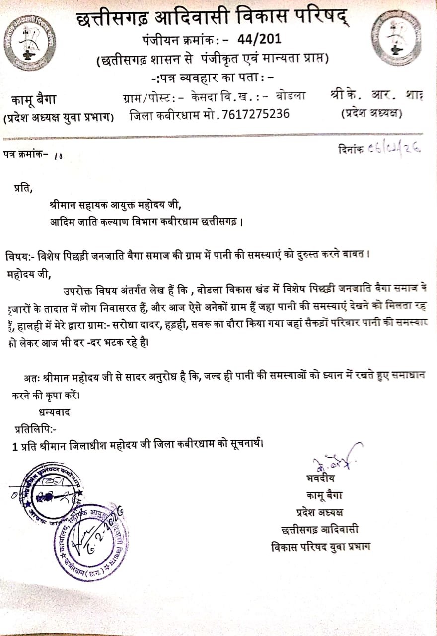 छत्तीसगढ़ आदिवासी विकास परिषद युवा प्रभाग के प्रदेश अध्यक्ष कामू बैगा द्वारा सहायक आयुक्त, आदिम जाति कल्याण विभाग कबीरधाम को भेजे गए पत्र में उल्लेख किया गया है कि बोड़ला विकासखंड के कई बैगा बहुल गांवों में आज भी सैकड़ों परिवार पानी की समस्या से जूझ रहे हैं। ग्रामीणों को पीने के पानी के लिए दूर-दराज भटकना पड़ रहा है।