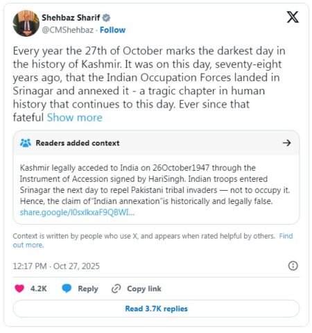 X की कम्युनिटी नोट्स ने इसे झूठा करार देते हुए तुरंत फैक्ट चेक जारी किया, जिससे शरीफ की सारी साजिश धरी रह गई. शरीफ के पोस्ट पर एक्स में प्रतिक्रिया देते हुए कहा गया है, “ये भ्रामक खबर है. महाराजा हरि सिंह 26 अक्तूबर 1947 को भारत में शामिल होने के लिए राजी हुए.