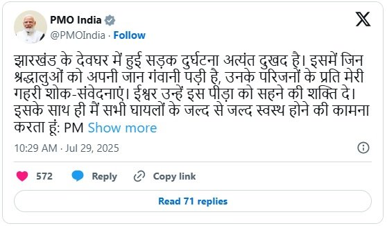 “झारखंड के देवघर में हुई सड़क दुर्घटना अत्यंत दुखद है। इसमें जिन श्रद्धालुओं को अपनी जान गंवानी पड़ी है, उनके परिजनों के प्रति मेरी गहरी शोक-संवेदनाएं। ईश्वर उन्हें इस पीड़ा को सहने की शक्ति दे। इसके साथ ही मैं सभी घायलों के जल्द से जल्द स्वस्थ होने की कामना करता हूं: