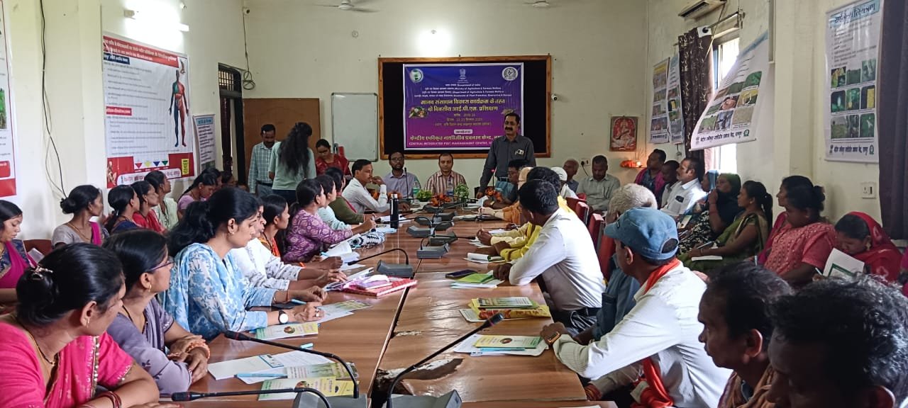कृषि विज्ञान केंद्र लखनपुर कटघोरा, कोरबा में दो दिवसीय मानव संसाधन विकास प्रशिक्षण कार्यक्रम खरीफ 2025-26 का आयोजन कृषि एवं किसान कल्याण मंत्रालय के वनस्पति संरक्षण, संगरोध एवं संग्रह निदेशालय के अंतर्गत केंद्रीय एकीकृत नाशी जीव प्रबंधन केंद्र, रायपुर और कृषि विभाग जिला कोरबा के सयुक्त तत्त्वधान में 22 एवं 23 सितंबर को आयोजित किया गया। कार्यक्रम मे कुल 75 प्रतिभागियों ने भाग लिया। कार्यक्रम में प्रगतिशील किसान, किसान उत्पादक संगठन एवं किसान मित्र, महिला समूह के किसान, कृषि विस्तार अधिकारी मौजूद थे। कार्यक्रम का उद्घाटन कार्यालय प्रमुख श्री नीरज कुमार सिंह, उप निदेशक (की. वि.), एस. पी. सिंह, वरिष्ठ वैज्ञानिक एवं प्रमुख, एम. एम. बघेल, सहायक संचालन कृषि के द्वारा किया गया। इस दो दिवसीय कार्यक्रम में प्रशिक्षणार्थी को श्री नीरज कुमार सिंह, उप-निदेशक (की.वि.) ने धान और सब्जी में लगाने वाले कीट और रोगों के लक्षण और उनके प्रबंधन के बारे में विस्तृत जानकारी प्रदान की। इसके अलावा कीटनाशकों का सुरक्षित और उचित उपयोग के बारे मे सभी किसानों को विस्तृत जानकारी प्रदान की। डॉ आशीष जायसवाल, स.व.स.अ (पी.पी.), ने किसानों को बीजोपचार का महत्व और मक्का मे लगने विभिन्न प्रकार के कीड़े और रोगों के लक्षण और उनका प्रबंधन के बारे में बताया। श्री कन्हैया लाल वैज्ञानिक सहायक ने आईपीएम तकनीकों से अवगत कराया गया और संबंधित पद्धति को अपनाने के बारे में चर्चा की तथा एन.पी.एस.एस. एप के प्रयोग ओर उनको एप को मोबाइल में डाउनलोड कराया और ऐप की विशेषताओ के बारे मे विस्तार पूर्वक बताया गया तथा उसी के साथ विभिन्न प्रकार के प्रपंच जैसे की पीले एवं नीले चिपचिपा प्रपंच, फेरोमोन प्रपंच, प्रकाश प्रपंच, फ्रूट फ्लाई प्रपंच आदि के बारे में विस्तार पूर्वक चर्चा की गई।