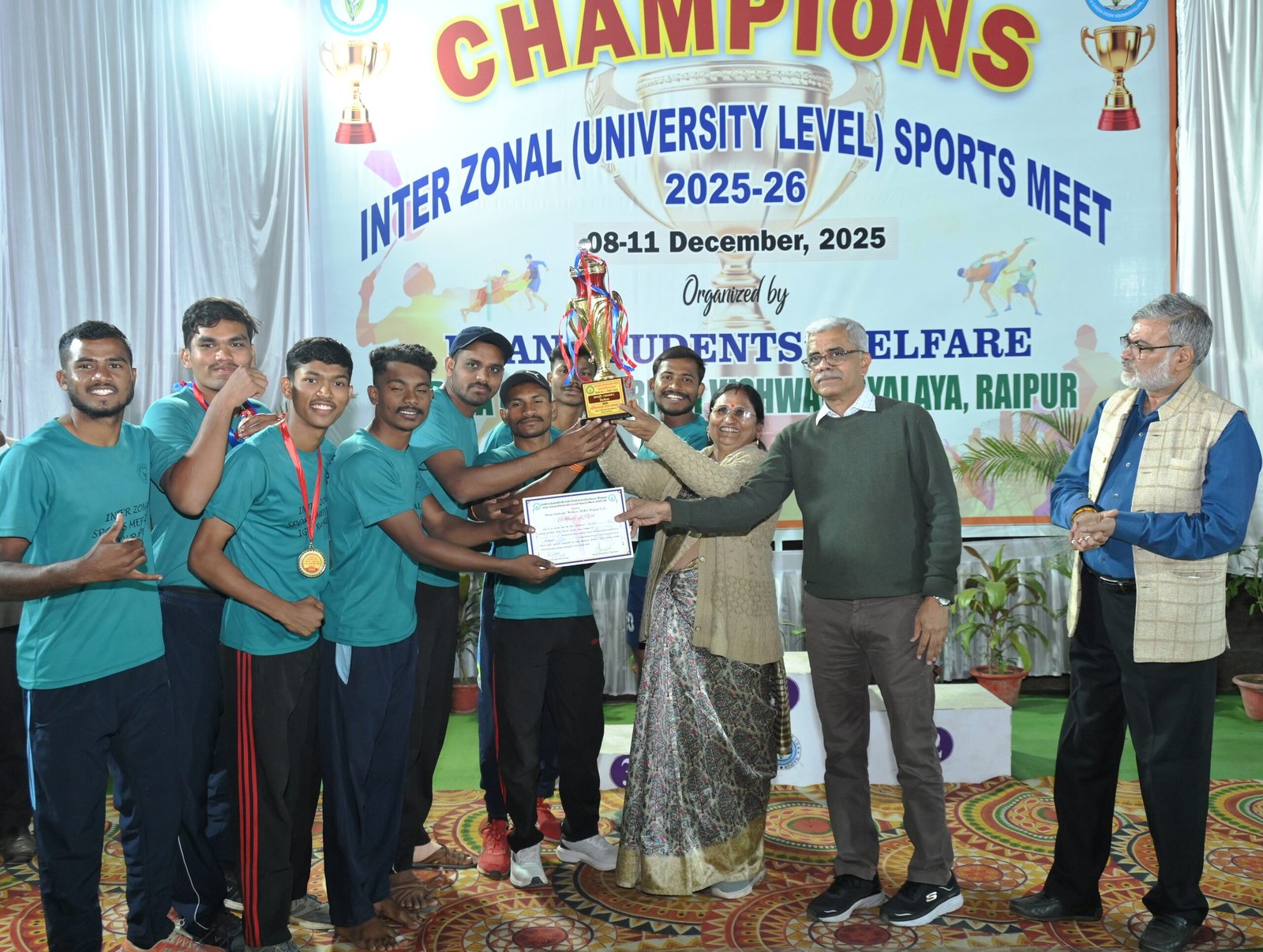 इंदिरा गांधी कृषि विश्वविद्यालय, रायपुर में 08 से 11 दिसम्बर 2025 तक आयोजित विश्वविद्यालयीन चार दिवसीय खेल कुम्भ का कल यहां समापन हुआ। कृषि महाविद्यालय, रायपुर के स्पार्ट्स कॉम्पलैक्स में चार दिवसीय खेल कुम्भ के समापन समारोह के मुख्य अतिथि डॉ. एस.एस. सेंगर ने विभिन्न खेल स्पर्धाओं में विजेता प्रतिभागियों को पुरस्कार एवं प्रमाण पत्र देकर सम्मानित किया। कार्यक्रम की अध्यक्षता अधिष्ठाता छात्र कल्याण डॉ. संजय शर्मा ने की। इस विश्वविद्यालयीन खेल-कूद प्रतियोगिता में इंदिरा गांधी कृषि विश्वविद्यालय के पूर्व, पश्चिम, उत्तर एवं दक्षिण जोन के अंतर्गत आने वाले समस्त महाविद्यालयों के 160 प्रतिभागी शामिल हुए। विश्वविद्यालयीन खेल कुम्भ में ईस्ट जोन 174 अंक प्राप्त कर ओवर ऑल चैम्पियन रहा, वहीं 91 अंक के साथ साऊथ जोन ओवर ऑल रनर अप रहा। सर्वश्रेष्ठ बालिका एथलीट का खिताब ईस्ट जोन की कुमारी संध्या नेताम तथा सर्वश्रेष्ठ बालक एथलीट का खिताब ईस्ट जोन के ही श्री कुनाल रावटे को प्रदान किया गया। समापन समारोह में कृषि महाविद्यालय रायपुर की अधिष्ठाता डॉ. आरती गुहे, कृषि अभियांत्रिकी महाविद्यालय के अधिष्ठाता डॉ. अजय वर्मा, निदेशक शिक्षण डॉ. ए.के. दवे, भी मौजूद थे। समापन समारोह में विभिन्न खेल स्पर्धाओं के निर्णायकगणों टीम मैनेजरों तथा आयोजन समिति के सदस्यों को भी सम्मानित किया गया। इस अवसर पर विश्वविद्यालयीन खेलकूद प्रतियोगिता में शामिल होने वाले समस्त चार जोन के खिलाड़ी टीम मैनेजर, रैफरी, शिक्षकगण अधिकारी एवं कर्मचारी उपस्थित थे। कार्यक्रम का संचालन डॉ. दीप्ती झा ने किया।