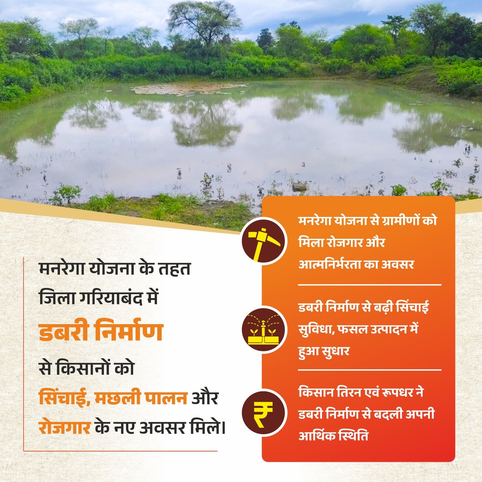 गरियाबंद जिले से ग्राम पंचायत मुड़ागांव के तिरन-रूपधर ने डबरी निर्माण कराने का मन बनाया और उत्सुकतापूर्वक मनरेगा योजना के जनकल्याण कारी कार्य का लाभ लेने हेतु आवेदन ग्राम पंचायत में ग्रामसभा में जमा कराया। इसके बाद पंचायत द्वारा प्रस्ताव तैयार कर जनपद पंचायत में प्रेषित किया गया। स्वीकृति होने के पश्चात् कार्य को प्रारम्भ किया गया। डबरी निर्माण से हितग्राही मछलीपालन एवं आस-पास के खेतों में सिंचाई कर, फसल लगाकर अपनी एवं परिवार की आजीविका अच्छे से कर रहे है।